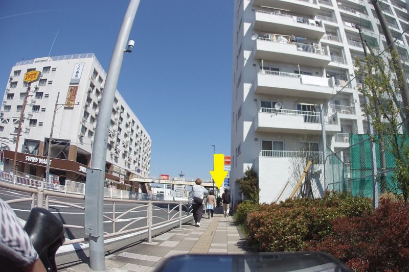 汐入駅前の交差点を右折したかったのですが、ここには横断方法が無いため仕方なく歩道橋を渡ることにしました。