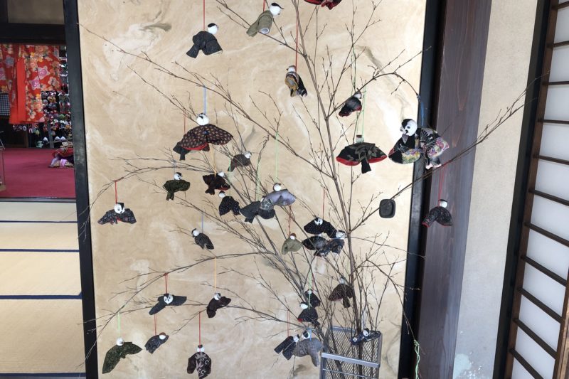 スズメと思われる人形が枯れ枝につるされていてこちらもかわいいですね。